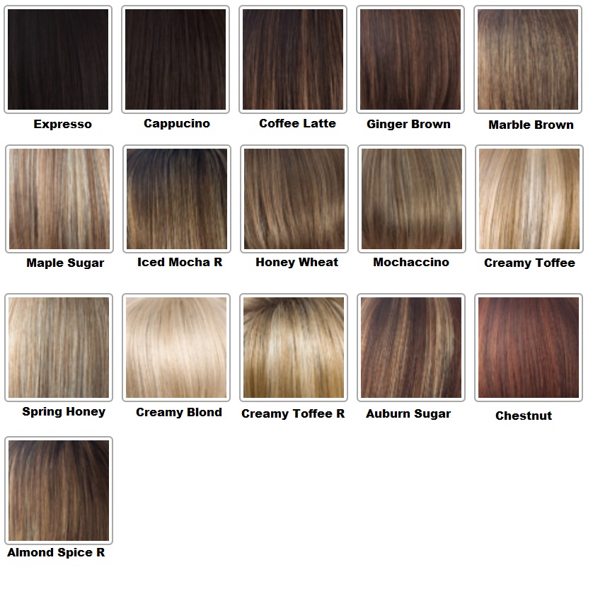 Almond Spice – R ,Auburn Sugar ,Cappucino ,Chestnut ,Coffee Latte ,Creamy Blond ,Creamy Toffee ,Creamy Toffee – R ,Expresso ,Ginger Brown ,Honey Wheat ,Iced Mocha – R ,Maple Sugar ,Marble Brown ,Mochaccino ,Spring Honey |